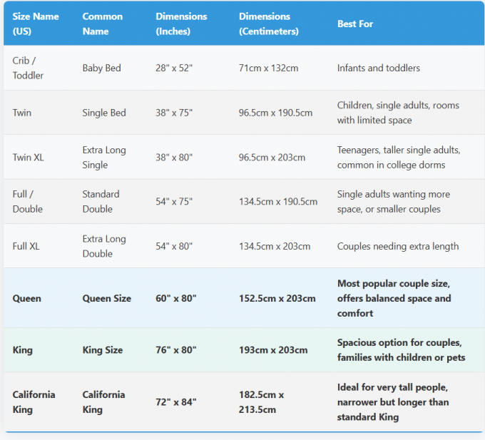Semua ukuran tempat tidur tersedia termasuk dimensi khusus